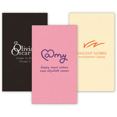 Our custom-printed linen-like napkins will impress your guests and add a polished touch to any event. Browse our extensive selection of pre-set napkin designs and text-only options, or you can design your own customized linen-like napkins, or create personalized linen-like guest towels with many choices. These personalized disposable linen-like guest towels can be placed in the restroom for a touch of class at your event or used in place of a dinner napkin for a luxurious meal.