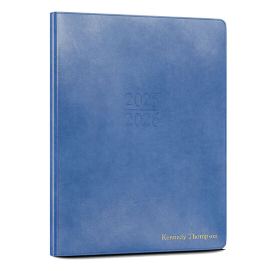Our 2026 leather family planner is parent-friendly features in a compact, efficient design. Planner includes a weekly section, a family reference section, a perforated removable list section, a notes section, and a reference section. Please note, this planner does not include a month at a glance section. Elegantly bound in a soft bonded leather cover with white pages with an ivory ribbon bookmark. The year 2025/2026 will be blind embossed (no color) on cover, as shown. The Floral Espresso and Floral Latte design will have the year 2025-2026 will be embossed as shown. Your choice of leather color, imprint color and personalization style. 104 sheets, double sided, size 7 x 9 in. Typestyle and positioning as shown.