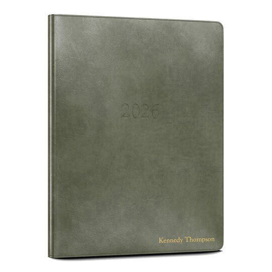 Our 2026 leather professional planner includes a month at-a-glance section, from July 2025 to June 2027, a weekly section from January to December 2026, a notes section, and world maps. Each week at a glance is presented in an easy-to-read vertical format. Days are divided into ½ hour increments from 7 AM to 7 PM with extra space at the beginning of each day. Elegantly bound in a soft bonded leather cover with ivory pages and an ivory ribbon bookmark. The year 2026 will be blind embossed (no color). Your choice of leather color, imprint color and personalization style. 96 sheets, double sided, size 7 x 9 in. Typestyle and positioning as shown.