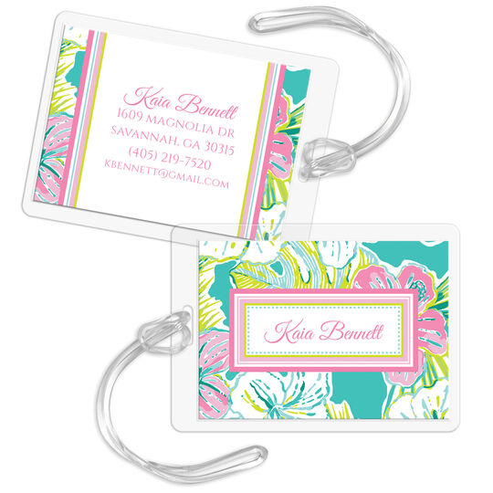 Stand out in baggage claim with this tropical flower set of personalized luggage tags. Size of tags are 3.5" x 2.5". Your choice of typestyles. Tags are laminated and have a clear plastic strap. Ink color and positioning only as shown.