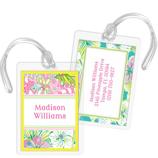 Stand out in baggage claim with this personalized set of luggage tags. Size of tags are 3.5" x 2.5". Your choice of typestyle. Ink color is available only as shown. Tags are laminated and have a clear plastic strap. Positioning only as shown.