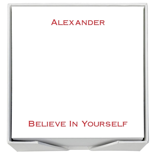 This memo square is a perfect accessory for taking down phone messages or jotting down notes. This set features 275 personalized 5" x 5" white sheets presented in a sturdy white paperboard holder and packaged in a white box. Your choice of flat ink color and typestyle.
