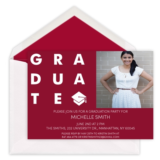 Congratulations graduate! You did it. Now it’s time to let family and friends know when the celebration begins. This is a set of flat photo invitations with a fully designed back. Blank white envelopes included. Your uploaded photo will be printed directly on invitation. Card size is 7" x 5". Your choice of design color, paperweight and card shape. Flat printed in ink color and typestyle as shown. Optional printed return address in flat ink and envelope linings available. Positioning only as shown.
