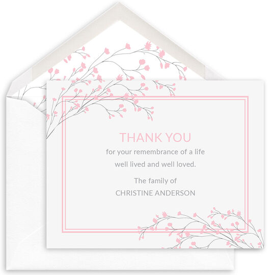 A beautiful flat sympathy note card to send to friends and family for expressing your honor for your loved one. Sympathy cards are flat printed in ink color of your choice. Size 5.5" x 4.25". Matching blank white envelopes included. Your choice of paper weight. Printed return address in flat grey ink and optional envelope linings are available. Typestyle and positioning only as shown.