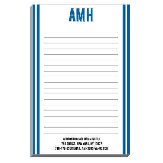 A colorful contemporary look will give each note your personal touch. Notepads are sized 5.5" x 8.5" and contain 100 sheets per pad. Initials and border design flat-printed in ink color of your choice. Bottom lines will always be flat printed in Black ink as shown. Optional ruled lines and blank white envelopes also available. Typestyles and positioning only as shown.