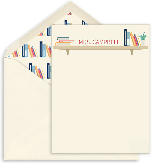 These flat note cards are adorable for teachers, avid readers and more. Size 4.25" x 5.5". Flat printed in ink color as shown with your choice of typestyle. Matching blank envelopes included. Optional printed return address in matching flat ink color and envelope linings are available. Your choice of paper weight. Positioning only as shown.