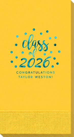 Sample shown with Confetti Class of 2026 design using Yellow guest towel with Turquoise Metallic Foil imprint and Center Horizontal placement