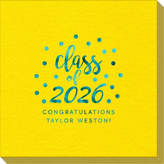 Sample shown with Confetti Class of 2026 design using Yellow napkin with Turquoise Metallic Foil imprint and Placement N - Horizontal Centered