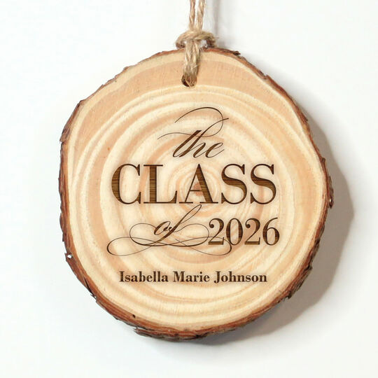 Beautiful laser cut and engraved wooden holiday ornament featuring our Classic Class of Graduation design. This unique ornament will be a perfect addition to your holiday ornament collection or give it as a unique keepsake gift. Due to natural variations in real wood, no two are alike. Diameter ranges between 3.5" - 4” and approximately.375" thick. Made from solid Natural wood. Includes twine ribbon for hanging. Typestyle and positioning only as shown.