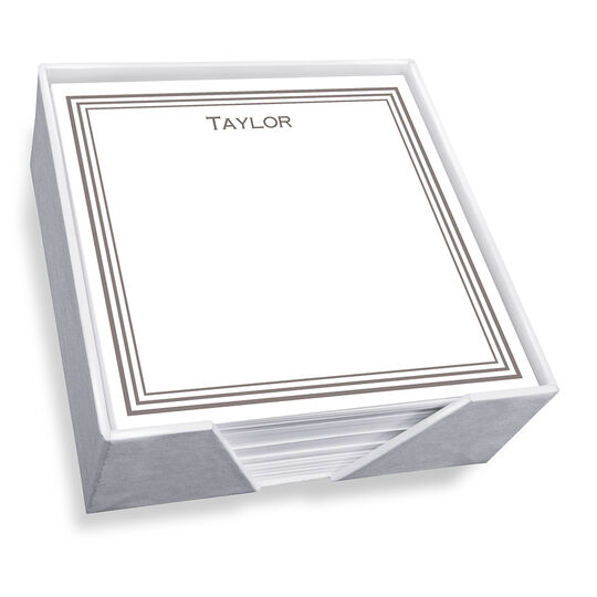 Make a great gift for everyone with this set of triple border memo sheets. This set features 275 personalized 5" x 5" white sheets presented in a sturdy white paperboard holder and packaged in a white box. Your choice of flat ink color and typestyle. Positioning only as shown.