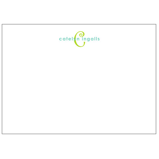 Set of white flat note cards with rounded corners. Matching blank white envelopes included. Size of note cards is 7" X 5".  Flat printed in ink color as shown using typestyle of your choice.  Printed return address with flat black ink available. Positioning only as shown.