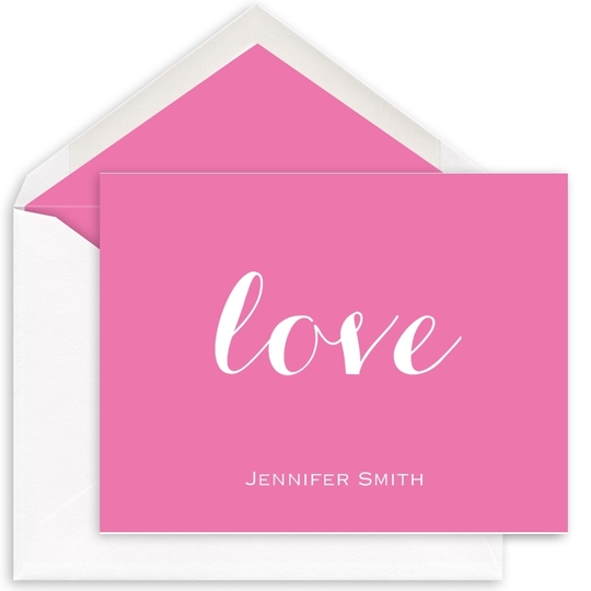 These fun foldover note cards are perfect notes to friends and family. Size is 5.5" x 4.25". Your choice of flat design color. Blank matching white envelopes included. Optional printed return address in flat ink and envelope linings available. Typestyle and positioning only as shown.