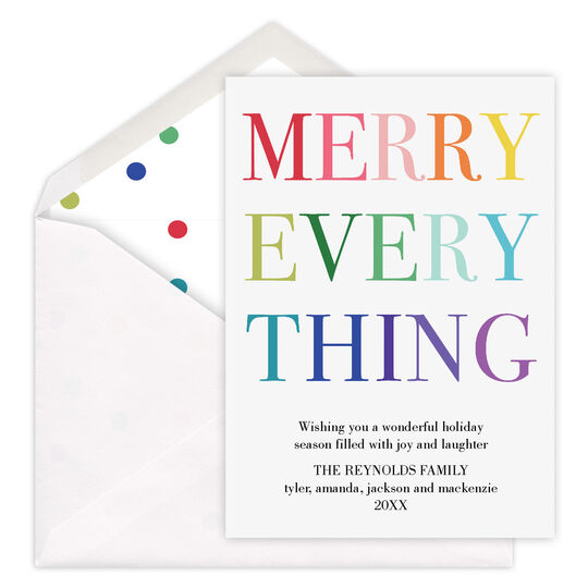 Sample shown using ENLI typestyle with optional Rainbow Polka Dots envelope lining.
