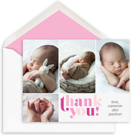 Your friends and family will love your note of thanks with this set of folded multi photo thank you notes. Flat printed in ink color as shown with typestyle of your choice. Size 5.5" x 4.25". Blank white envelopes included. Printed return address in flat Black ink is available. Optional envelope linings and inside imprint available. Positioning only as shown.