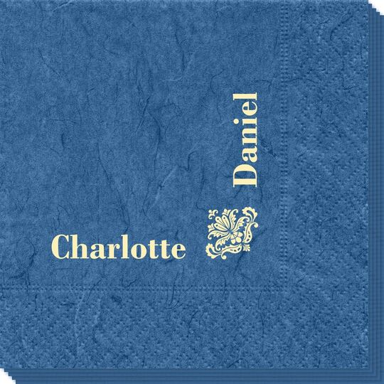 Set of premium Bali 3-ply paper beverage napkins features a subtle nature inspired printed background. Free online preview. Choice of 6 napkin colors and 40+ imprint colors. Typestyle and positioning only as shown. Bali napkins are recyclable. Inside of napkins are white. Sourced from Europe and personalized in the USA.  Approximate size 4.875" x 4.875". Shrink wrapped in sets of 50.