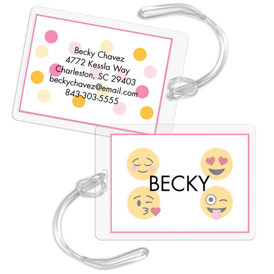 Stand out in baggage claim with this set of beautiful personalized luggage tags. Size of tags are 3.5" x 2.5". Tags are laminated and have a clear plastic strap. Imprint color, typestyle and positioning only as shown.