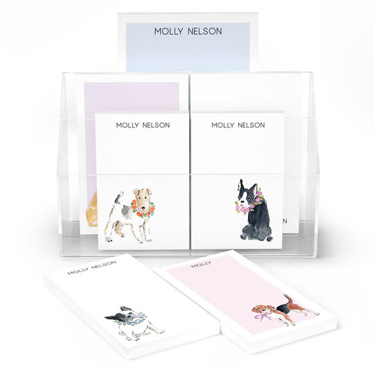 A perfect notepad set for your favorite dog lover. A modern and trendy set of notepads with a total of 700 sheets. Set of 7 notepads each with 100 sheets per notepad. The sizes include: 2 pads that are 3.25" x 5", 2 pads  that are 3.25" x 6", 2 pads that are 4" x 6" and 1 pad that is 5" x 8". Flat printed in ink color and typestyle as shown. Optional acrylic holder available. Positioning only as shown.