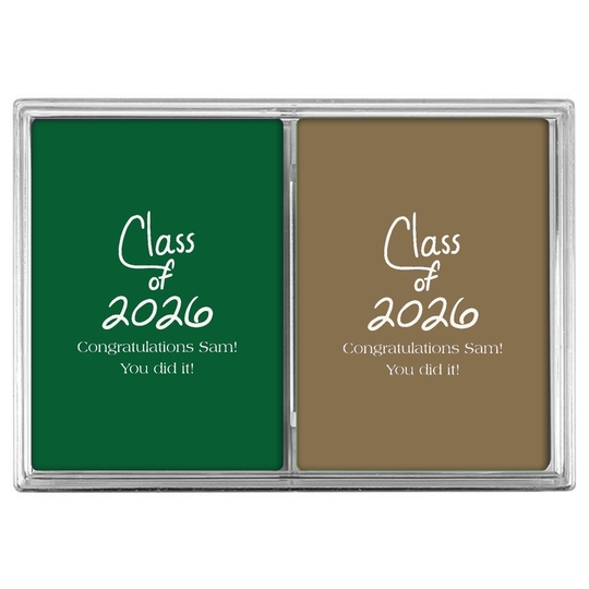 Set of two personalized standard playing card decks in an acrylic holder. Box measures 5.5 in. x 3.75 in. x 1 in. Cards measure 3.5 in. x 2.5 in. You select the playing card colors and the imprint color. Made and printed in the USA.