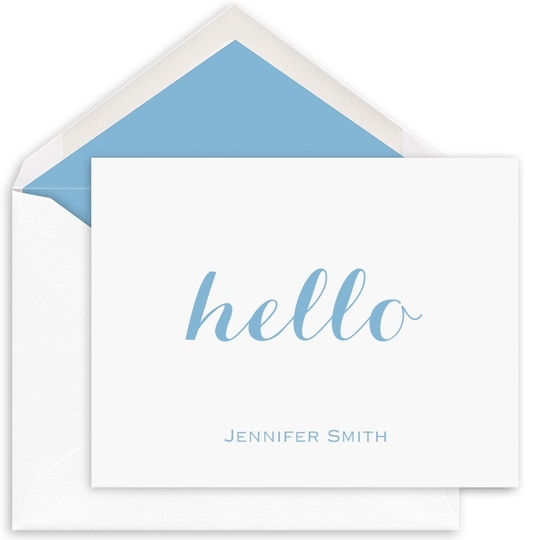 These fun foldover note cards are perfect for notes to friends and family. Size is 5.5" x 4.25". Your choice of flat ink color. Blank matching envelopes included. Optional printed return address in flat ink and envelope linings available. Typestyle and positioning only as shown.
