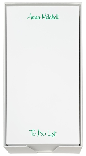 Here is a perfect desk accessory for to do lists, grocery lists and more! This set features 260 personalized 4.5" x 5.5" white sheets presented in a sturdy white paperboard holder and packaged in a white box. Flat printed in your choice of ink color. Typestyle and positioning only as shown.