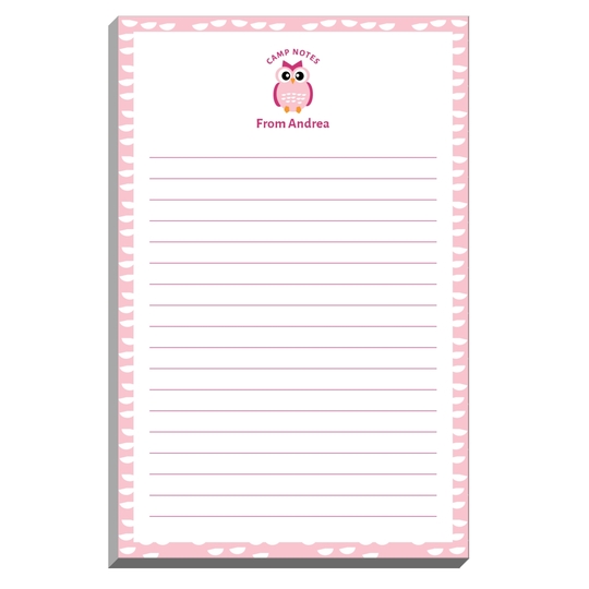 Fun and trendy camp notepad. Notepads size is 5.5" x 8.5" and contain 100 sheets per pad. Your choice of Owl design color. Flat Printed in ink color and typestyle as shown. Ruled lines are available. Blank white envelopes available. Positioning only as shown.