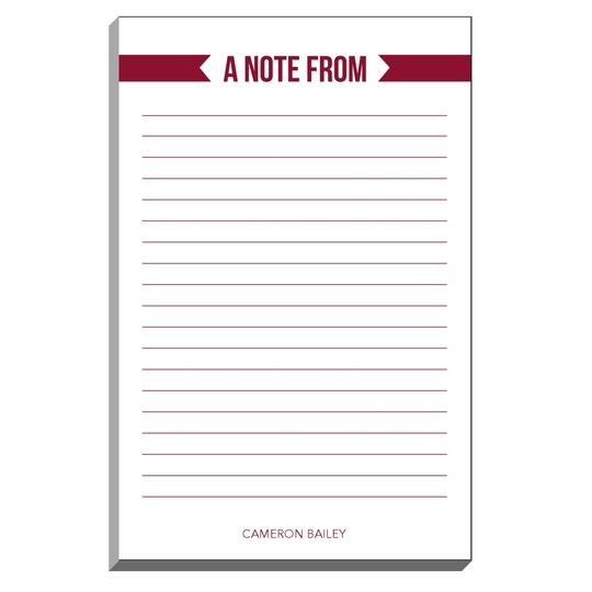 Add a personal touch to your desk with this trendy and modern personalized notepad. Notepad size is 5.5" x 8.5" and contain 100 sheets per pad. Flat-printed in ink color of your choice with typestyle as shown. Optional blank envelopes and ruled lines available. Positioning only as shown.