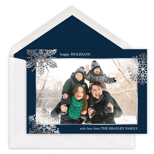 A Stationery Studio exclusive! Celebrate the season with our Holiday photo cards with beautiful large silver foil stamped snowflake border design. Matching blank white envelopes are included. Photo cards come with fully printed card back design. Size of photo cards are 7" x 5".  Flat printed in typestyle and ink color as shown. Your choice of card shape. Optional envelope linings and printed return address imprint in your choice of flat ink available. Positioning only as shown.