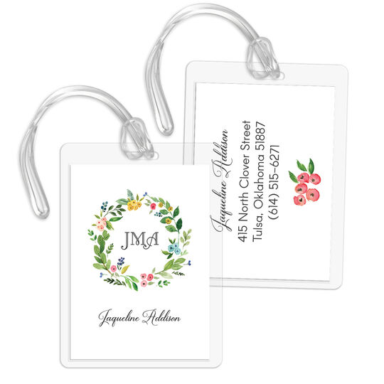 Stand out in baggage claim with this personalized set of whimsical luggage tags. Size of tags are 3.5" x 2.5". Tags are laminated and have a clear plastic strap. Your choice of typestyles. Ink colors and positioning only as shown.