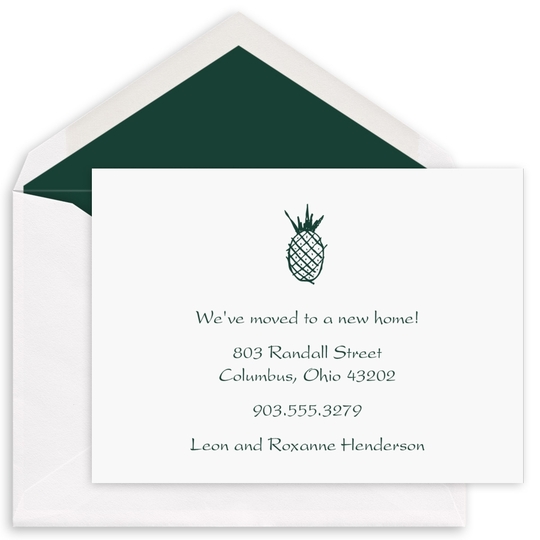 Let friends and family know of your new address with this set of flat moving announcements. Your choice of stock color, paper weight and card shape. Cards measure 6.25" x 4.625". Matching blank envelopes included. Your choice of flat ink color. Optional envelope lining and printed return address available. Typestyle and positioning only as shown.