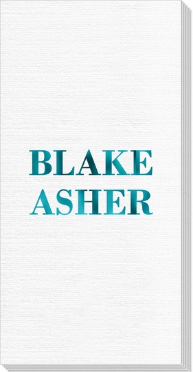 Sample shown using guest towel with Turquoise Metallic Foil imprint and Center Horizontal placement