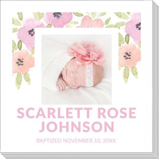 These quality photo napkins with a watercolor floral border will be picture perfect for your next party. This is a set of white 3 ply photo napkins which offers a nice large space for your image and imprint. Your photo will be digitally printed above the personalization. Your choice of napkin size, floral border color, typestyle and size of imprint. Imprint color and positioning only as shown. Napkins will arrive in a box. Orders of 1500+ arrive in sleeves within a carton.