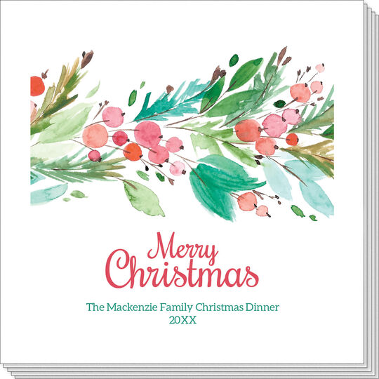 These quality white 3 ply napkins will add the finishing touch to your holiday table. Your choice of napkin size. Imprint color, typestyle and positioning only as shown. Napkins will arrive in a box. Orders of 1500+ arrive in sleeves within a carton.