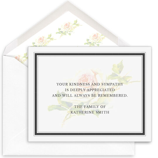 A lovely yellow rose appears delicately in the background of your condolence cards in honor of your loved one. Set of foldover condolence cards flat printed in ink color as shown. Size 5.5" x 4.25". Matching blank white envelopes included. Printed return address in flat Grey ink is available. Optional envelope linings and inside imprint available. Typestyle and positioning only as shown.